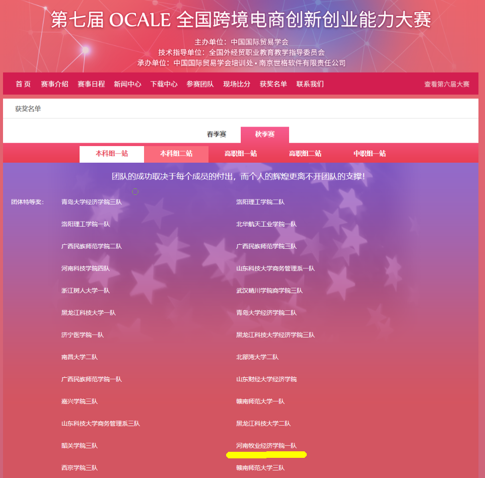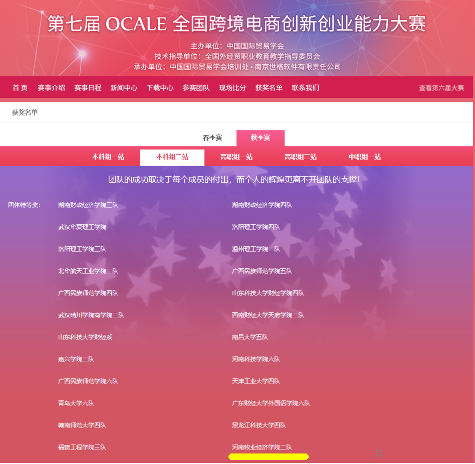 2021年11月17日,第七届OCALE全国跨境电商创新创业能力大赛落下帷幕。由v站体育官网老师指导国际经济与贸易本科班学生组建的三个团队参加本科组比赛,经过艰苦、科学系统的培训演练及3天12个回合的激烈角逐,所有团队均喜获全国团体佳绩,分别为两个特等奖项、一个一等奖项,这是我校参加该赛项的最好成绩,成绩的取得充分彰显了我校国际经济与贸易专业跨境电商方向的办学实力。
