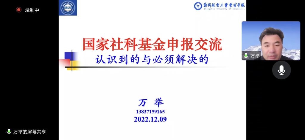 2022年12月9日下午,v站体育官网通过线上会议的方式组织召开了2023年度国家社科基金项目申报经验交流会。本次会议邀请了郑州航空工业管理学院硕士生导师万举博士进行国家社科基金申报经验分享,科学技术处副处长张红霞、物流与电商学院副院长李艳菊、v站体育官网院长李光、副院长杜玲、孙晓林、科研办公室主任以及v站体育官网和兄弟院系五十余位教师参加了本次会议。会议由李光院长主持。