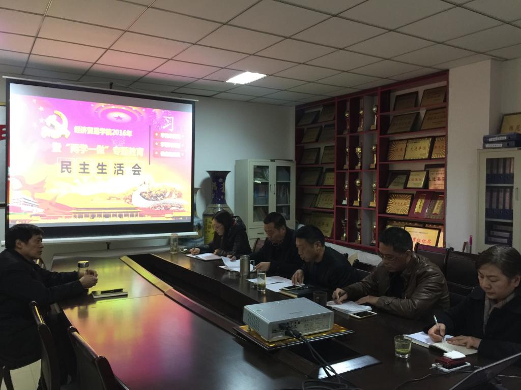 根据«河商牧业经济学院关于开展“两学一做”学习教育的实施方案»的要求,按照《经济贸易学院2016年暨“两学一做”学习教育专题民主生活会实施方案》的安排, 12月12日下午3:30,经济贸易学院在教学办公楼216会议室召开2016年度曁“两学一做”学习教育专题民主生活会。学校副校长许圣道出席会议,学院领导班子全体成员参加会议。会议由院党总支书记牛建绥主持。