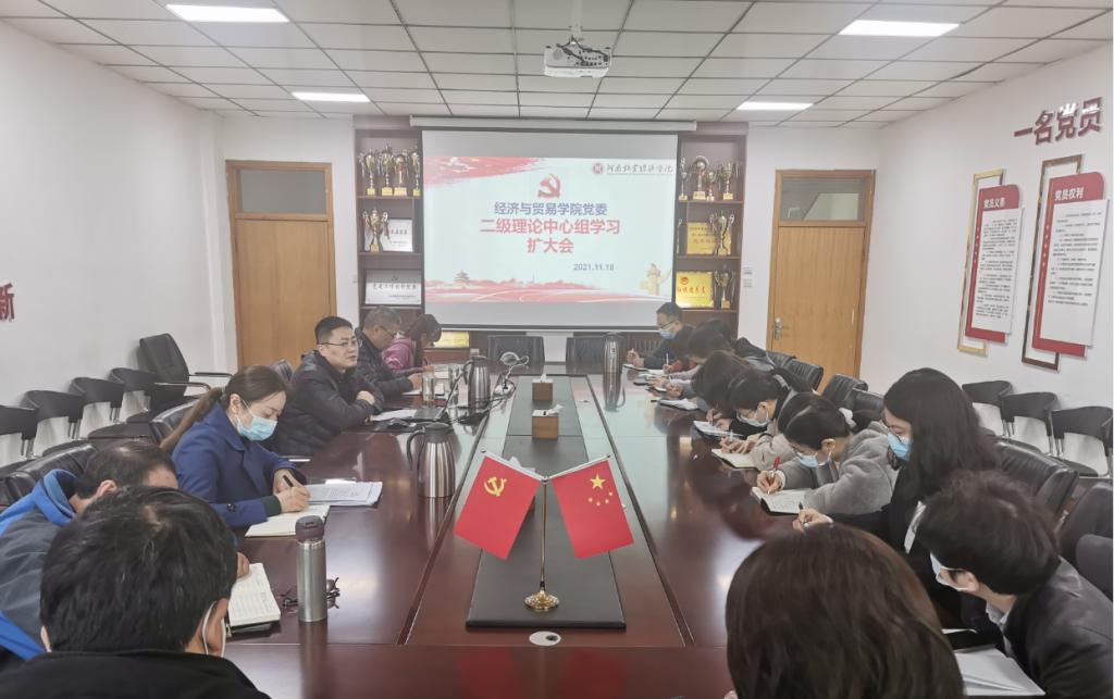 11月18日上午,v站体育官网党委二级理论学习中心组组织集体学习扩大会,传达学习党的十九届六中全会精神、河南省第十一次党代会精神,研究部署学习贯彻具体举措,会议由院党委书记张松刚主持,学院领导班子、科级干部、全体辅导员参加会议。