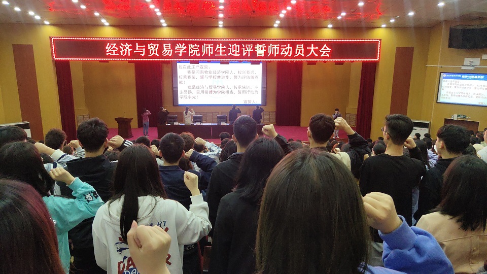 为提高同学们参与迎评的意识与积极性, 4月20日-21日,v站体育官网在英才校区学术报告厅召开两场“师生迎评誓师动员大会”。v站体育官网党委书记张松刚,党委副书记贾艳艳,团委书记、学工办主任刘佳楠、团委副书记、学工办副主任申作光、全体辅导员和18级、19级、20级在校生参加。龙子湖校区在校生通过在线直播方式参与。大会由院党委副书记贾艳艳主持。