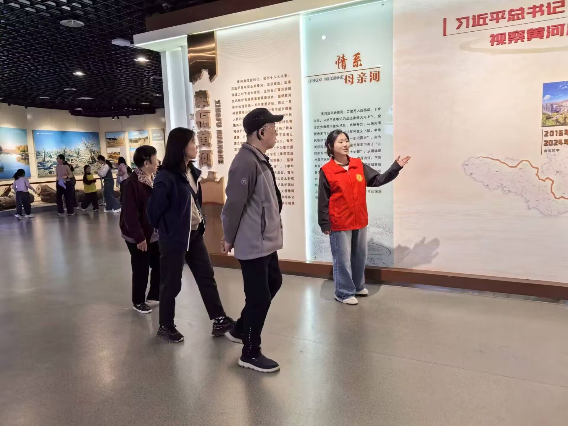 活动正式开始前,志愿者们已在各自负责的展厅就位,分别开始熟练讲解词,同时了解展厅布局,为讲解工作做准备。活动正式开始后,志愿者们凭借扎实的功底和认真热情的态度,获得了游客们的赞赏。在为年龄较小的孩子们讲述黄河故事时,志愿者们循循善诱,将黄河的历史知识讲得生动有趣,激发了孩子们的求知欲,让孩子们在游玩的同时也学习到了知识。活动期间,志愿者们还旁听了专业讲解员的讲解并认真观察学习,希望未来可以像这些专业人员一样,为游客带来更加生动、更加精彩的讲解体验。