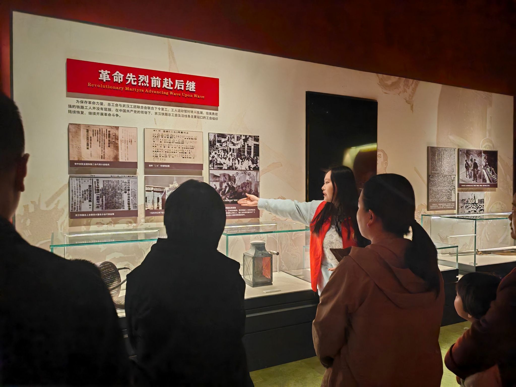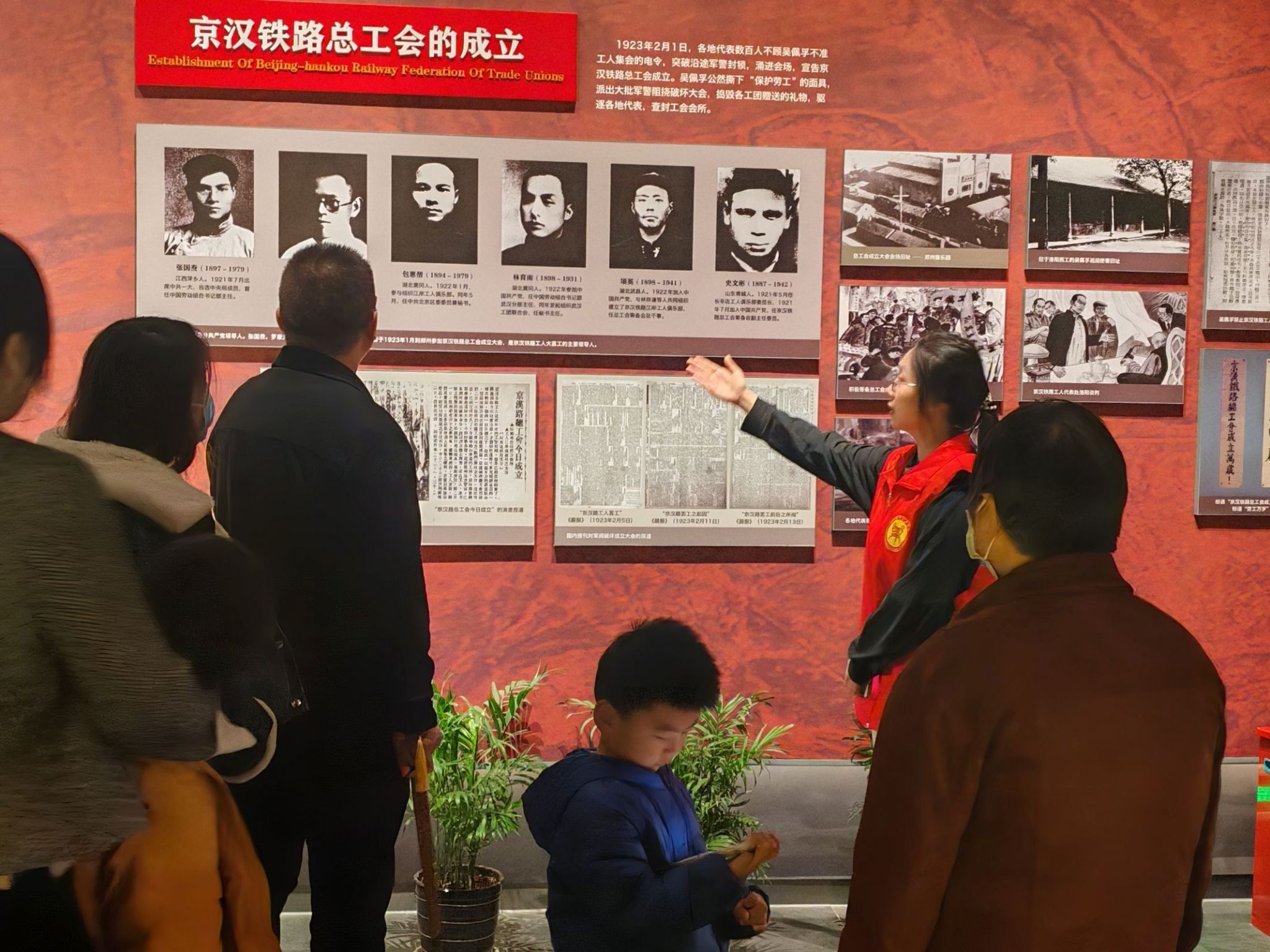 活动当日,身着统一服装的志愿讲解员们提前在各展区等候,以饱满的状态迎接游客。面对络绎不绝的游客,讲解员们凭借扎实的知识储备,生动地讲述了京汉铁路总工会成立的艰辛历程、二七惨案和工人们的抗争壮举。在讲解过程中,志愿者们注重史实的准确传达,积极与游客互动交流,通过情景再现使游客们身临其境,当讲解到林祥谦、施洋等革命先烈的英勇事迹时,许多游客被他们为工人阶级献出生命的精神所打动。为提升讲解实效,讲解员们灵活调整讲解方式,向学生讲解时侧重知识拓展,对儿童则采用趣味引导的方式进行讲解,面对郑州科技学院第二党支部成员,志愿者们则着重剖析“二七精神”与新时代党建的传承关系。志愿者们的讲解服务让游客们触摸到了有温度的革命历史,并获得了高度评价。活动结束,讲解员们总结交流讲解经验,并合影留念。