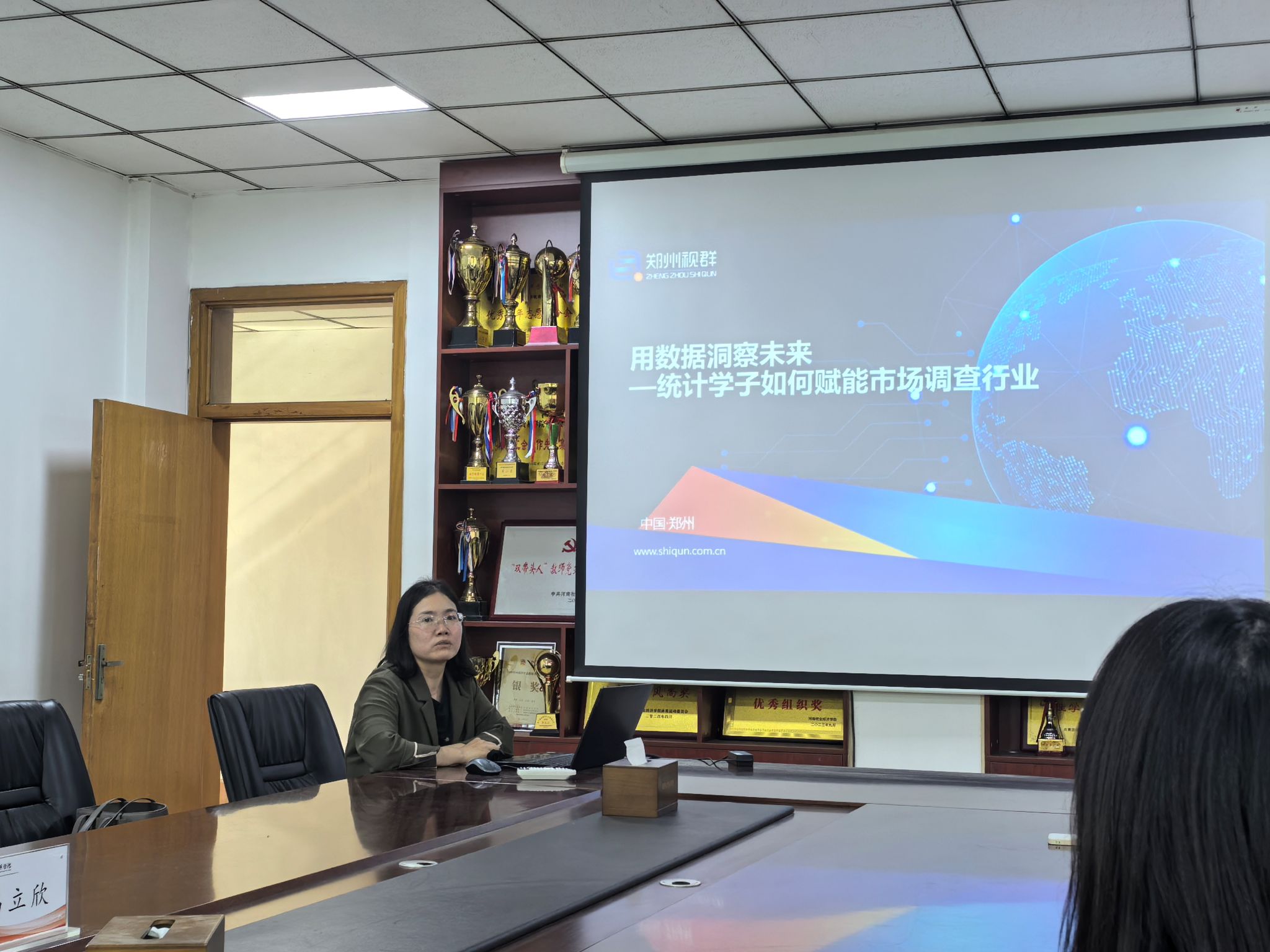 为加强校企合作,帮助学生深入了解行业动态和就业前景,2025年4月10日下午v站体育官网在英才校区教学办公楼327举办了郑州视群市场调查有限公司专场宣讲会,企业市场部经理冯立欣、v站体育官网统计学教研室全体教师及统计学专业2025届毕业生共同参与了本次宣讲会,宣讲会由v站体育官网统计学教研室主任王翔翔主持。
